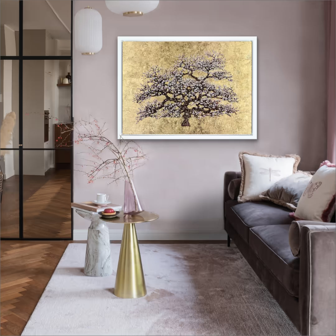 A soft grey wall allows a gold-leaf or copper-accented piece to shine. Earthy ceramics or linen cushions can draw out subtle tones from within an artwork, creating a cohesive and elegant space.