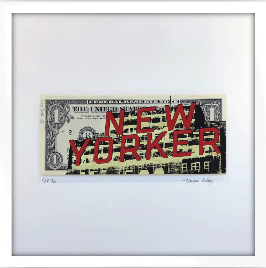 Jayson Lilley is renowned for blending screen printing, painting, and collage to create striking urban landscapes. His signature style features expansive compositions enhanced with radiant metal leaf detailing and glowing skies, adding depth and energy to his work.