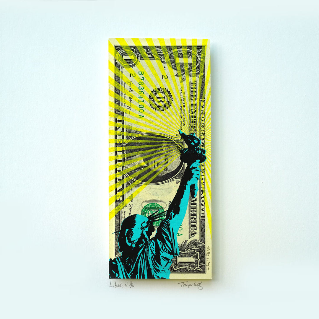 Jayson Lilley is renowned for blending screen printing, painting, and collage to create striking urban landscapes. His signature style features expansive compositions enhanced with radiant metal leaf detailing and glowing skies, adding depth and energy to his work.